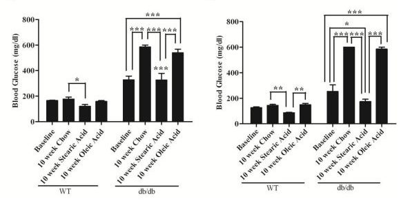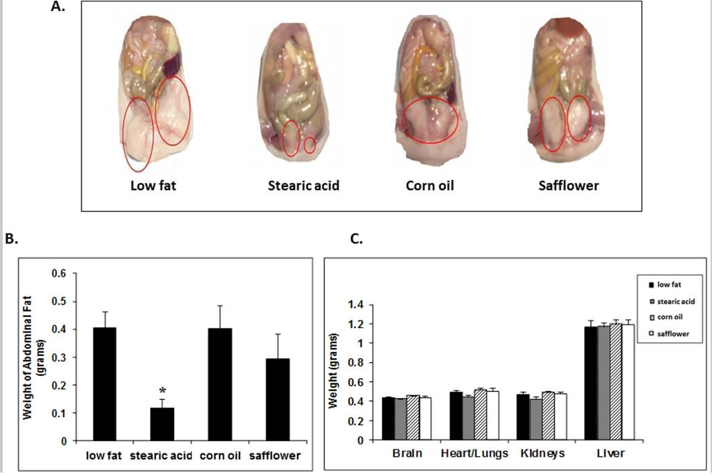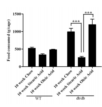 Przedstawiona tutaj dieta jest wzbogacona kwasem stearynowym lub oleinowym i podawana przez 10 tygodni. W diecie nie wzbogaconej kwasem stearynowym, lecz kwasem oleinowym (oliwa z oliwek), pomimo utraty masy ciała zanotowano znacznie podniesioną glukozę i progresję cukrzycy i to niezależnie od ilości utraconej tkanki tłuszczowej.